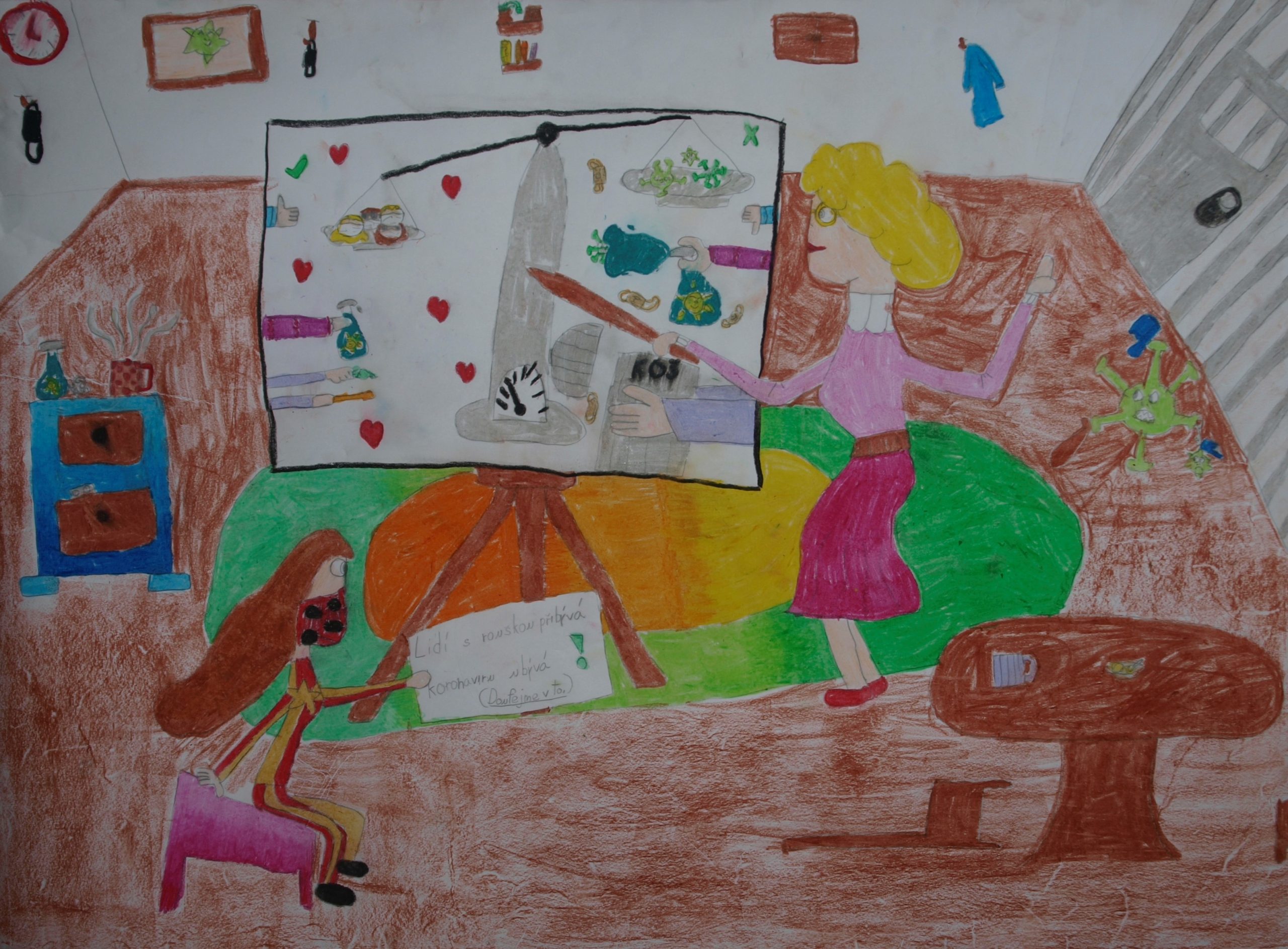 Korona policie (na obrázku vpravo s modrou čepicí) dohlíží na pedagožku která vyučuje dítě v cele. Jedná se o abstraktní pojetí distanční výuky v době pandemie.
